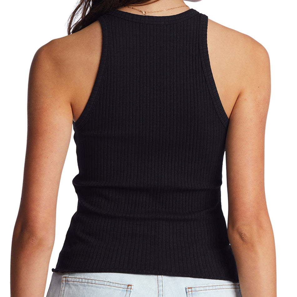 With rib knit lines borrowed from the boys, the Tomboy Tank Top takes owns its feminine side with a fitted shape and ruffle hem. An everyday essential, the women’s tank top adds a modern high neckline to the rib knit staple.